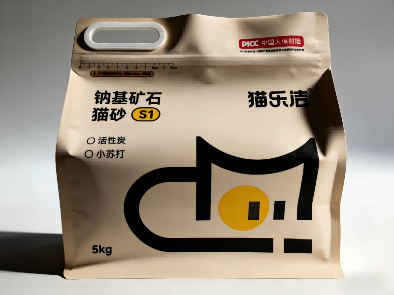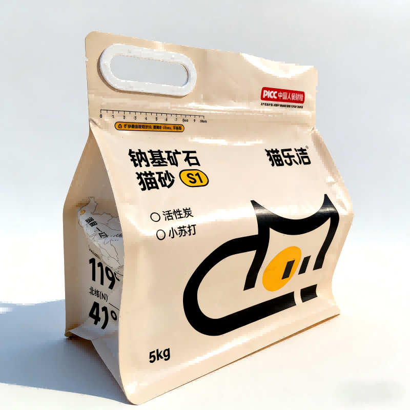 Estrutura do saco: A estrutura de vedação de oito lados fornece um formato vertical e estável, perfeito para exibição em prateleiras. O zíper resselável e o punho de plástico reforçado permitem fácil manuseio e armazenamento seguro de areia para gatos de 5 kg.